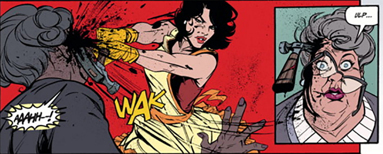 Quand il s’agit de recréer une ambiance typique comme la décennie qui a vu éclore le talentueux Johnny Cash et naître la Vème république française, le dessin se doit d’être irréprochable ou presque. A ce niveau, que ce soit le trait de Joëlle Jones ou la colorisation de Laura Allred, le contrat est parfaitement rempli puisque le graphisme illustre parfaitement le propos : les scènes de meurtres sont réalistes et violentes quand les situations familiales nous laissent entrevoir la vie telle qu’elle pouvait l’être à l’époque. Cette dernière facette du scénario sera d’ailleurs également au centre des attentions puisque si d’un côté, Josie doit élaborer le meilleur plan pour assassiner sa cible, d’un autre, elle devra réussir à concilier sa vie de famille avec sa carrière de tueuse. Une tâche loin d’être de tout repos surtout quand la belle-mère vit sous le même toit que la petite famille et n’hésite pas à mettre son nez dans ce qui ne la regarde pas !