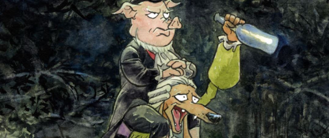 Guère d’insultes dans ces quelques lignes puisque dans La fin du monde en trinquant, Jean-Paul Krassinsky a choisi de raconter une histoire humaine avec des animaux en guise de personnages. C’est ainsi qu’un astronome réputé, Nikita Petrovitch, est un cochon issu de la bourgeoisie russe tandis que son acolyte (imposé) n’est autre qu’un jeune chien aussi énergique que maladroit.