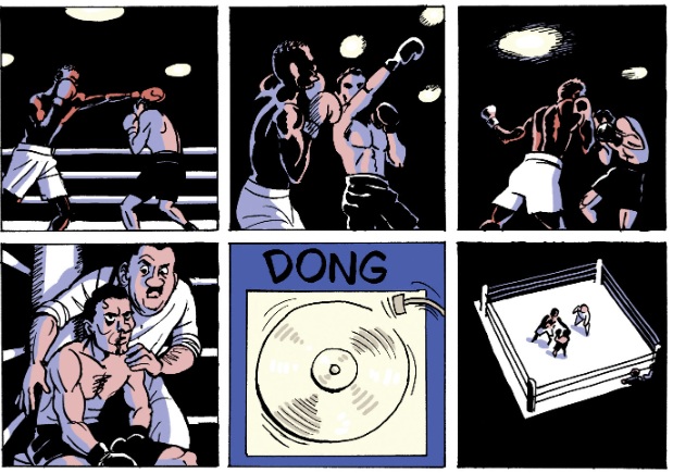 Parmi celles-ci, l’ambiance. Une ambiance qui part d’une simplicité dans le trait, qui nait dans le choix des couleurs et des ombrages, qui mène directement le poing de l’artiste dans le regard du lecteur. Et puis, il y a ces détails qui n’en sont pas tant ils contribuent à bien des regards à nous transporter dans cette autre époque. Un panneau sur une épicerie « Interdit aux chiens et aux Italiens » nous renvoie rapidement au contexte social de ce Marseille du passé. Le parler direct d’un entraineur ajustera nos sourires et notre empathie. Tout ceci intégré à une structure qui frôle la perfection.